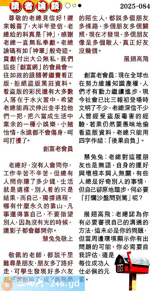 第零八四期讀者論談 1.尊敬的老總見信好!遲來報喜了,大半年登信,老總給的料真是「神」,感謝老總一直無私奉獻。老總論碼有如「神筆」般奇迹。貢獻付出大公無私,我們這些「創富網」的會員會一往如故的跟隨著繼費看正版,拒絕盜版黑莊資料。看盗版的彩民還有大多數人落在于水火當中,希望老總能再次伸出金手拉他們一把,把六當成生活中業余的一種小娛樂,小賭怡情,永遠都不會傷身,呵呵打擾了。創富老會員 〖創富老會員〗:現在全球也在努力維護知識產權,人們才有動力繼續進步,現今社會已比三報初登場時文明了不少,老總深信不少人曾經受盜版毒害的經驗,若果仍然要愚昧地偷看盗版資料,老總只能用四字作結:「後果自負」。 2.老總好,沒有人會問你,工作辛苦不辛苦,但總有人問你賺了多少錢,生活就是這樣,別人看的只是結果,而自己,獨撐過程,哪有什麼永久的靠山,凡事還得靠自己,不要指望別人,因為沒有光的時候,連影子都會離開你。慧兔兔敬上 〖慧兔兔〗:老總對這種朋友也是無語,自身的運好與壞根本與人無關,有些人總是好奇別人的事情,但自己卻原地踏步,何必要「打爛沙盤問到篤」呢? 3.敬佩的老師,都說千里難尋是朋友,朋友多了路好走,可學生發現好多六友都把我刪掉了,成了最熟悉的陌生人,都說多個朋友多條路,多個朋友多個關照,現在才發現,多個朋友像是多個敵人,真正好友沒幾個。展翅高飛 〖展翅高飛〗:老總認為你有必要審視自己的溝通的方法,這未必是你的問題,但當周邊環境顯示你有出問題的可能,你必需要自我評估,這是每位成功人仕必俱的元素。