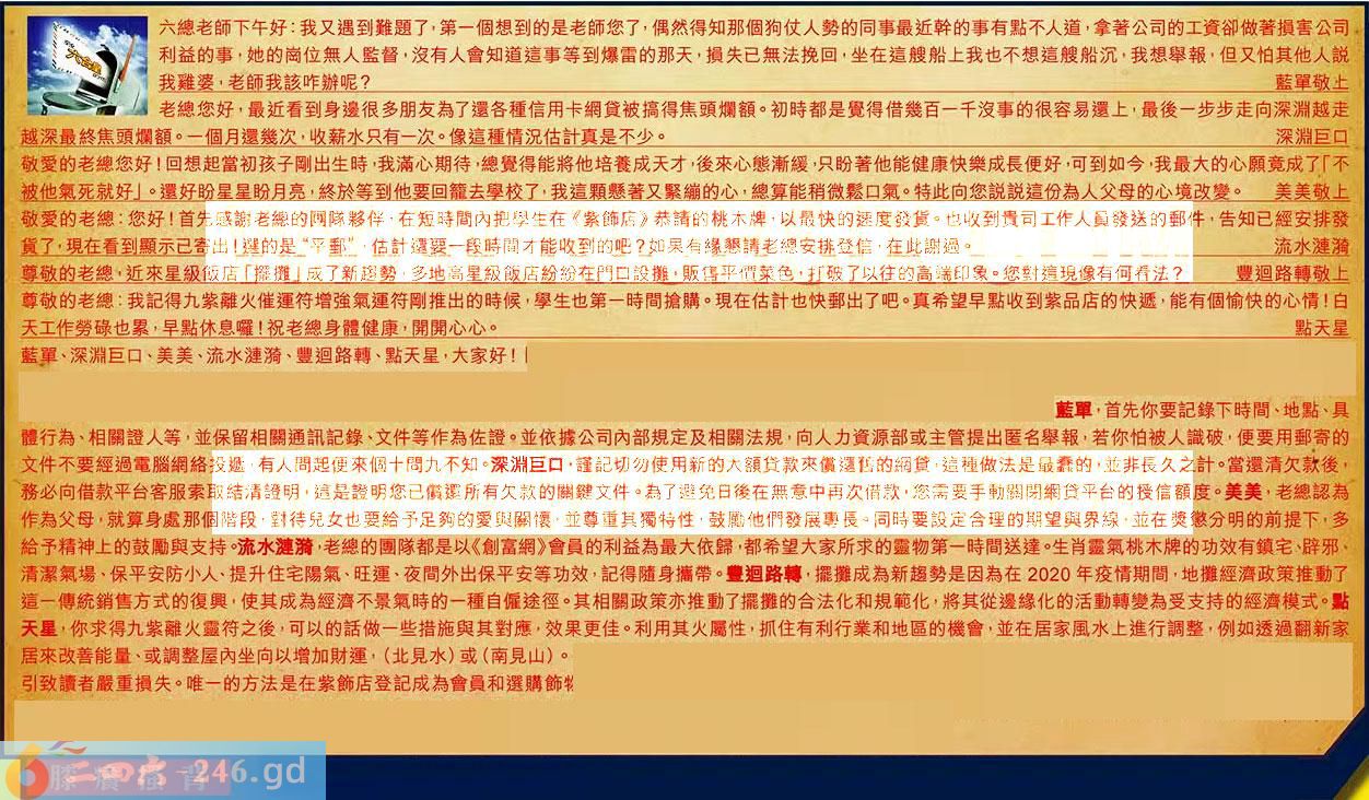 【1】.六總老師下午好:我又遇到難題了,第一個想到的是老師您了,偶然得知那個狗仗人勢的同事最近幹的事有點不人道,拿著公司的工资卻做著損害公司利益的事,她的崗位無人監督,沒有人會知道這事等到爆雷的那天,損失已無法挽回,坐在這艘船上我也不想這艘船沉,我想舉報,但又怕其他人說我雞婆,老師我該咋辦呢?藍單敬止