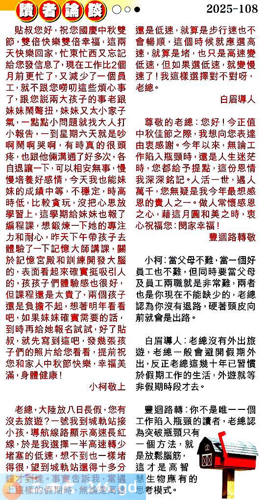 2.老總,大陸放八日長假,您有沒去旅遊?一號我到城軌站接小孩,導航線路顯示高速長紅線,於是我選擇一半高速轉少堵塞的低速,想不到也樣堵得很,望到城軌站還得十多分鐘才到達。事實告訴我,當遇上這樣的假期時,無論是高速還是低速,就算是步行速也不會暢順,這個時候就應選高速,就算是堵,也只是高速變低速,但如果選低速,就變慢速了!我這樣選擇對不對呀老總。白眉導人