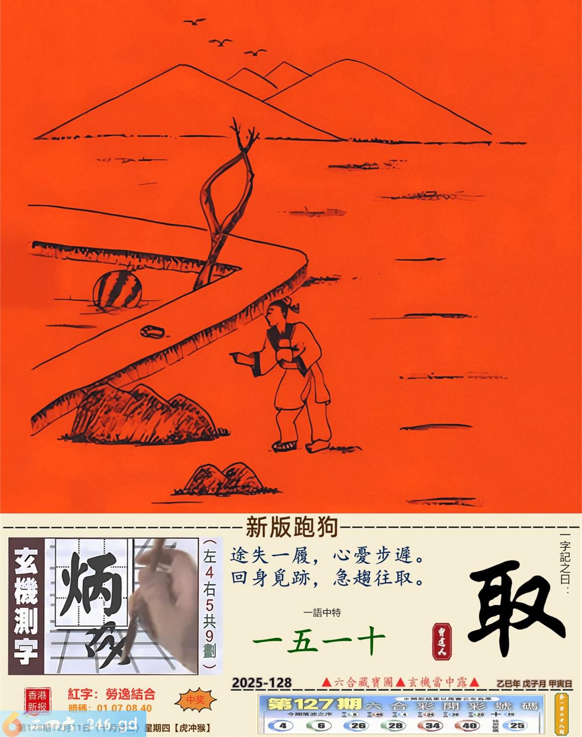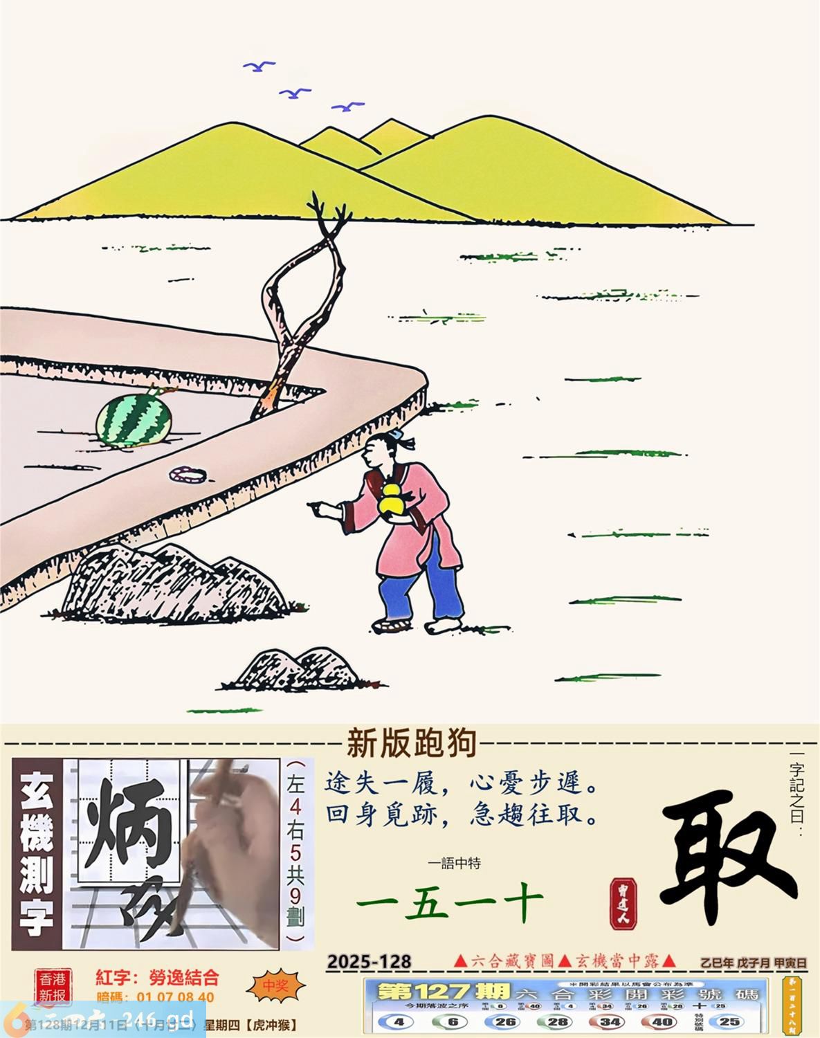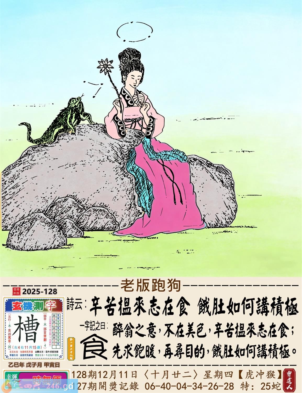 2025年12月11日128期侯(戊申)(大溪水) 128期:老版跑狗玄機一字記之曰:【食】 詩云:辛苦搵來志在食餓肚如何講積極 醉翁之意,不在美色,辛苦搵来志在食; 先求飽暖,再尋目的,餓肚如何講積極。 玄機測字:《槽》 密圖詩:月下五人在徘回 《記》:江湖武器十八件 特碼大小單雙句:昔日常夸八最好 今期必中:高順 128期:特碼歇后語 美丽而不遮体-----华而不实 128期正版四字梅花诗:添砖加瓦。 128期火车头:烧伤兔。诗:羊死猴伤,半岭天风一九三。 128期香港第一手欲钱料:低三下四? 128期曾道人说:“石头?” 128期另版四字梅花诗:山上放羊。 128期香港第一手欲钱料:欲钱看西游记第八回。 128期曾道人说:“女人三十生与死之间会想念些什么”? 128期:二字經:多事 128期:井中有特码 128期:智力金壤:红颜知己 128期:信箱紅字:【勞逸結合】 128期:【暗碼:01-07-08-40】 128期:一語中特:【一五一十】 發财玄機圖:温馴膽小潔白可愛圖中明羊紅綠 128期:藏寳圖 新:作意叁年醉月华 老:前山急雨过溪来 禁:狗禁:4尾玄機字《衰》 2025年128期【生活幽默】版 〖錢攒够了〗 某妻,刁蠻狡猾。夫:“我想納妾。” 妻:“你這麽窮,哪有錢買妾?你若有錢,我可以答應。” 于是丈夫拼命攒私房錢,又找朋友借了點,拿回家告訴妻子:“錢攢够了,你看!" 妻子搶過錢來,納入袖中,盈盈下拜:“我情願做小,這錢正好買了奴家。”