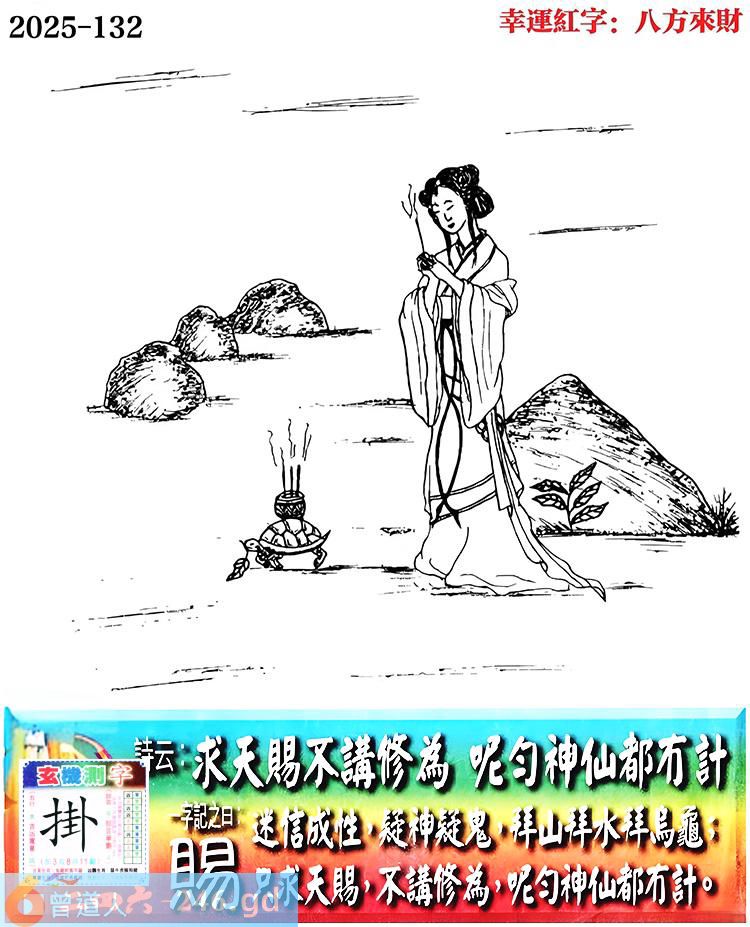 132期老版跑狗一字記之曰:【賜】 詩雲:求天賜不講修為,呢勻神仙都冇計。 迷信成性,疑神疑鬼,拜山拜水拜烏龜; 只求天賜,不講修為,呢勻神仙都冇計。 玄機測字:《掛》