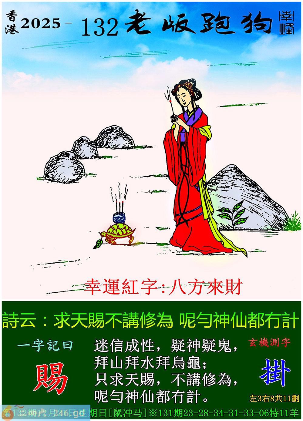 132期老版跑狗一字記之曰:【賜】 詩雲:求天賜不講修為,呢勻神仙都冇計。