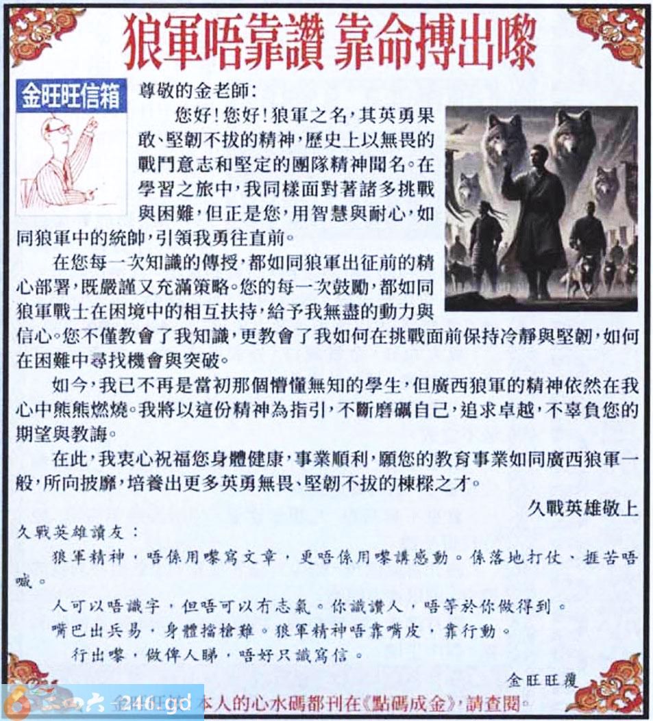 002期:金旺旺信箱彩民推荐→→《狼軍唔靠讃 靠命搏出嚟》