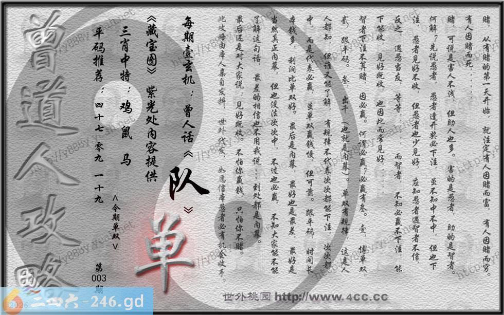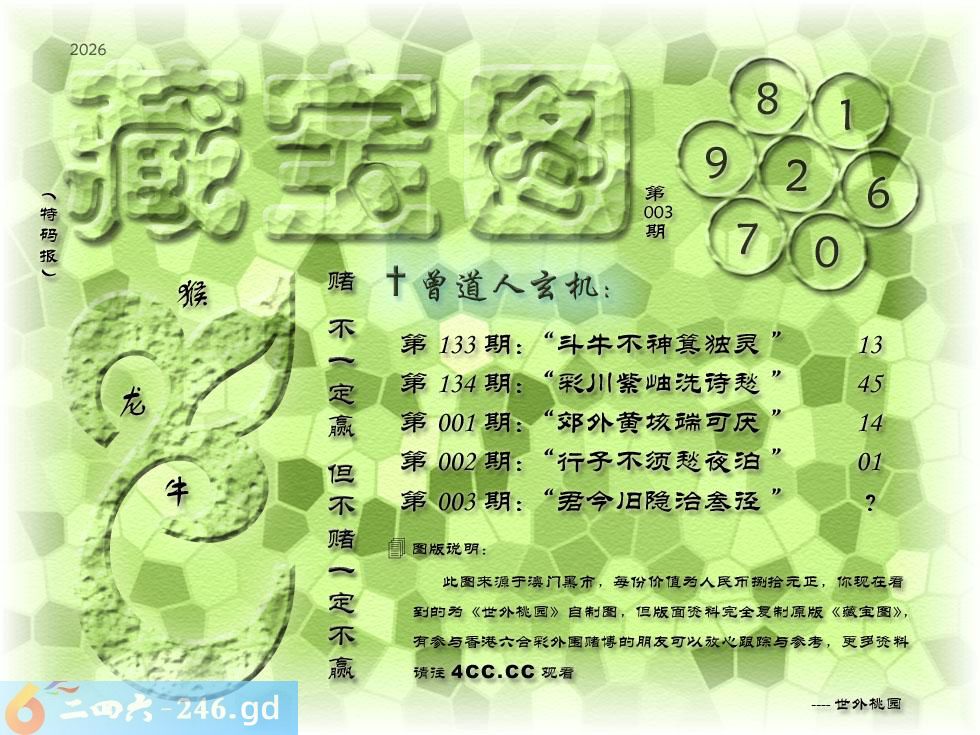 003期藏寶圖 新:君今旧隐治叁径 老:交游相见休相问 禁:狗 禁:3尾 玄機字:《队》