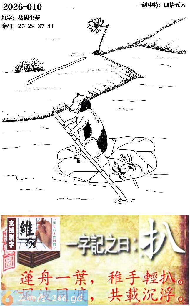 010期跑狗一字記之曰:【扒】 蓮舟一葉,稚手輕扒。 風波同渡,共載沈浮。