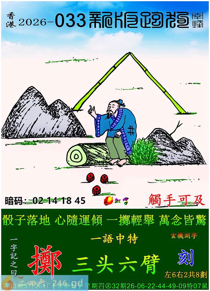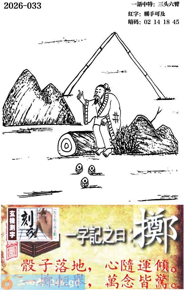 033期跑狗一字記之曰:【擲】 骰子落地,心隨運傾。 一擲輕舉,萬念皆驚。 玄機測字:《刻》 一語中特:三头六臂