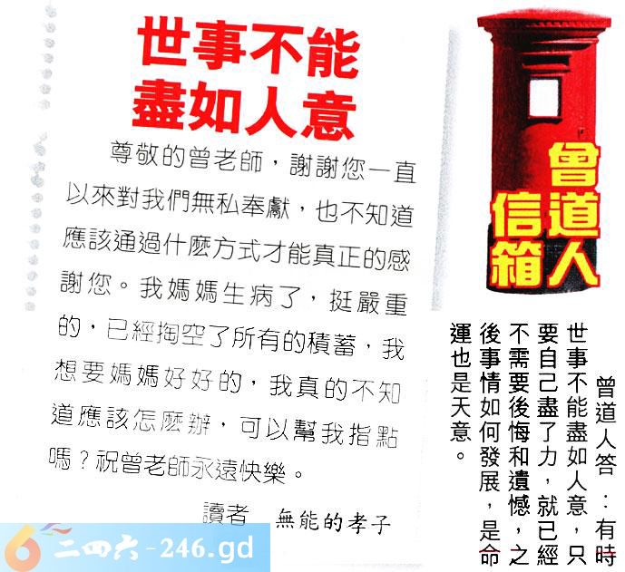 035期老版跑狗一字記之曰:【盡】 詩雲:山窮水盡疑無路,努力未必有回報。 求救無門,如何是好,山窮水盡疑無路; 難逃生天,坐等運到,努力未必有回報。 玄機測字:《洶》