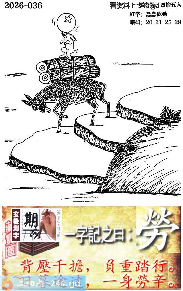 036期跑狗一字記之曰:【勞】 背壓千擔,負重踏行。 日暮途遠,一身勞辛。 玄機測字:《期》 一語中特:四捨五入