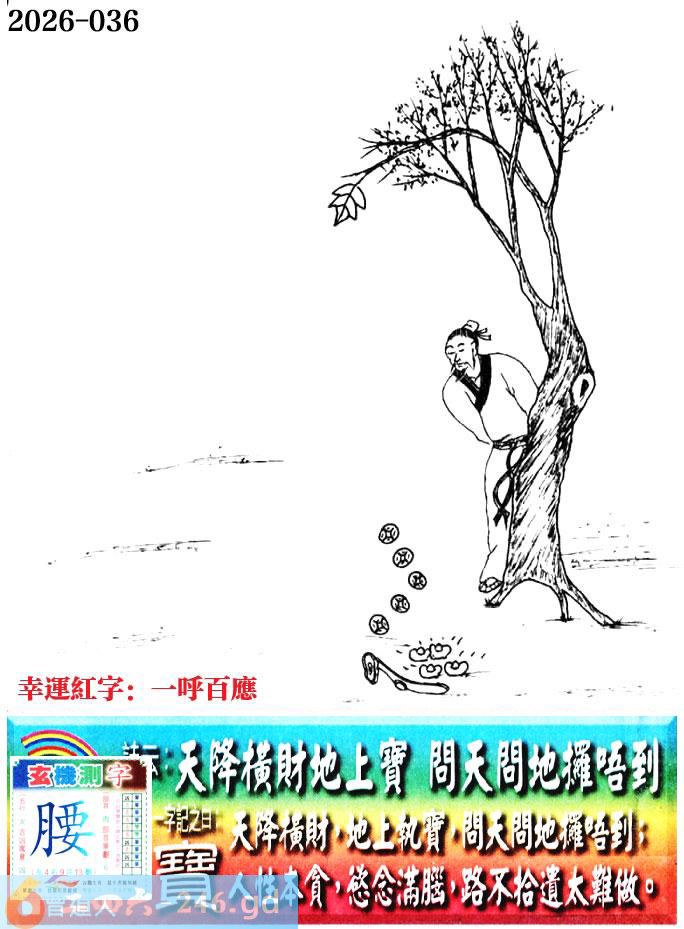 036期老版跑狗一字記之曰:【腰】 詩雲:天降橫財地上寶,問天問地攞唔到。