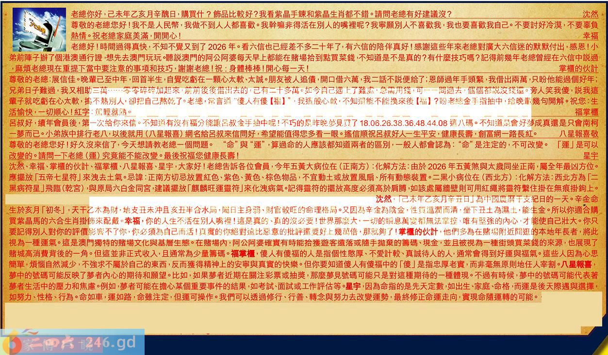 【3】.老總好!時間過得真快,不知不覺又到了2026年。看六信也已經差不多二十年了,有六信的陪伴真好!感謝這些年來老總對廣大六信迷的默默付出,感恩!小弟前陣子辦了個港澳通行證,想先去澳門玩玩聽説澳門的阿公阿婆每天早上都能在賭場拾到點買菜錢,不知道是不是真的?有什麼技巧嗎?記得前幾年老總曾經在六信中説過,麻煩老總現在重提下當中要注意的事項和技巧,謝謝老總!祝:身體棒棒!開心每一天!掌櫃的伙計