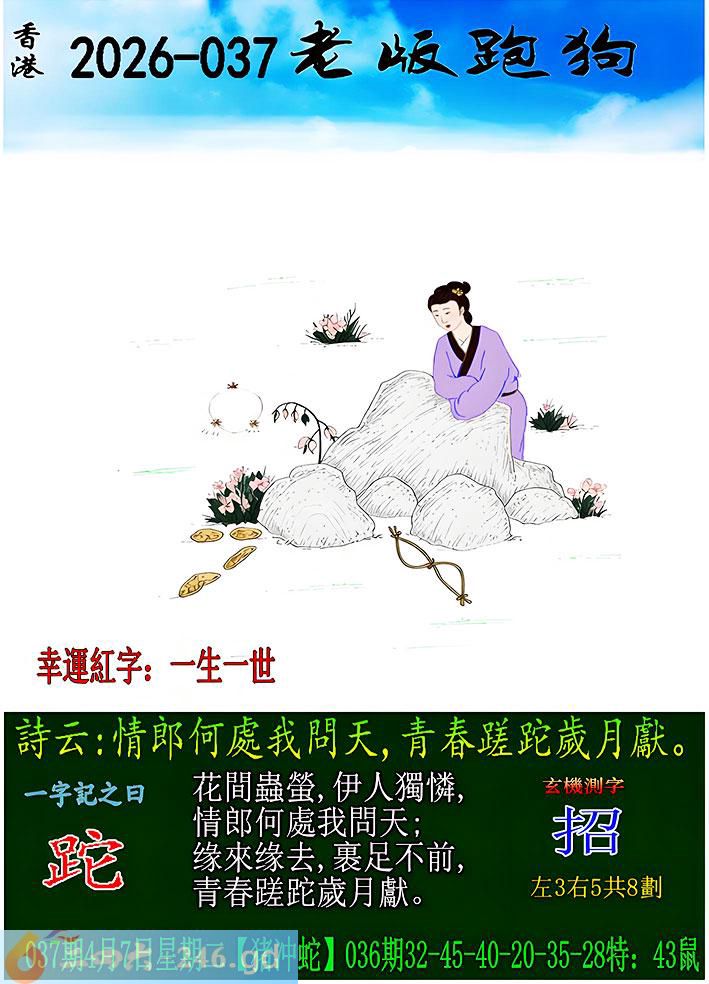 037期老版跑狗一字記之曰:【跎】 詩雲:情郎何處我問天,青春蹉跎歲月獻。 花間蟲螢,伊人獨憐,情郎何處我問天; 緣來緣去,裹足不前,青春蹉跎歲月獻。 玄機測字:《招》