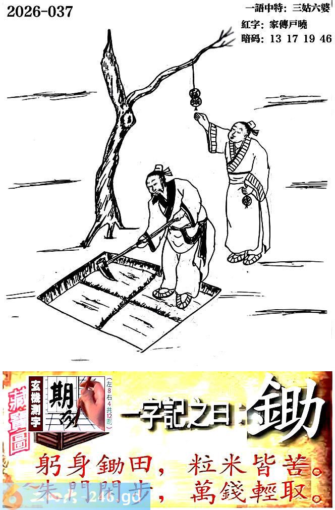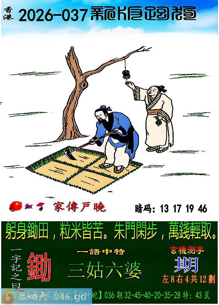 2026年4月7日二月二十星期二钗钏金猪日冲蛇 037期:老版跑狗玄機一字記之曰:【跎】 詩云:情郎何處我問天,青春蹉跎歲月獻 花間蟲螢,伊人獨憐,情郎何處我問天; 緣來緣去,裹足不前,青春蹉跎歲月獻。 玄機測字:《招》 密圖詩:有七有八出紅波 記:來回三局敗一地 特碼大小單雙句:非驢非馬 今期必中:趙雲 037期:特碼歇后語 嫩苗苗-----根底浅 037期正版四字梅花诗:小肚鸡肠。 037期火车头:烧伤狗。诗:牛死龙伤,一三并取开头奖。 037期香港第一手欲钱料:起床。 037期曾道人说:“女人?” 037期另版四字梅花诗:春天来临。 037期香港第一手欲钱料:欲钱找跑得快最蠢的动物。 037期曾道人说:“为什么过四十三的男人喜欢赌博”? 037期:二字经:蓝红。 037期:扫把是特码 037期:智力金壤:天罗地网 037期信箱紅字:【家傳戸曉】 037期暗码:【13171946】 037期一語中特:【三姑六婆】 發財玄機圖:形影不離探索態望圖中明猴紅藍 037期:藏寶圖 新:只今犹有疏野调 老:青门瓜地新冻裂 禁:蛇禁:8尾玄机字《逦》 2026年037期【生活幽默】版 〖穩定的工作〗 一青年做事總是毛手毛脚,所以老是失業。 這一次,他又找到一份工作,是替一家古董店幹活。 才上班的第一天,他就不小必把店裹的一衹較昂貴的玻璃瓶給摔碎了。 老板很生氣:"這衹瓶子的價錢我會在你每個月的工资内扣。" 這青年一聽,鬆了口氣説:"謝天謝地,我终于找到了一份穩定的工作。"