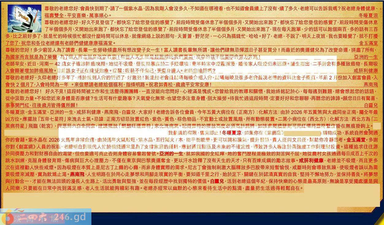 第038期《六合皇信箱文字版》10000%正確!!! 冬暖夏涼、金玉滿堂、亞洲的一生、戒菸利健康、燕南飛、白靈兒,大家好!老總告訴各位會員,今年五黃大病位在(正南方):化解方法:由於2026年五黃煞與太歲同坐正南,屬全年最凶方位·應擺放「五帝七星符」來洩去土氣.忌諱:正南方切忌放置紅色、紫色、黃色、棕色物品,不宜動土或放置風扇、所有動態裝置。二黑小病位在(西北方):化解方法:西北方為「三黑病符星」飛臨(乾宮),與原局六白金同宮,建議擺放「麒麟旺運靈符」來化洩病氣。記得靈符的擺放高度必須高於后膊,如該處屬牆壁則可用紅繩將靈符繫住掛在無痕掛鉤上。 【1】.尊敬的老總您好:會員快到期了,請了一個紫水晶,因為我剛入會沒多久,不知道在哪裡看,也不知道會員續上了沒有,續了多久,老總可以告訴我嗎?祝老總身體健康、福蠢雙全,平安喜樂、萬事順心。冬暖夏涼 〖冬暖夏凉〗:如果你在《紫飾店》購物成功,系統自然會開通你的會藉。紫水晶在2026火馬年非常合適,由於馬年火氣較旺,紫水晶,五行屬火/木,能平衡能量,更可以調和躁氣、提升智慧、貴人運與文昌運,幫助你冷靜思考。 【2】.尊敬的老總您好,好久不見登信了,都快忘了給您登信的感覺了,前段時間受傷休息了半個個多月,又開始出來跑了,都快忘了給您登信的感覺了,前段時間受傷休息了半個個多月,又開始出來跑了,都快忘了給您登信的感覺了,前段時間受傷休息了半個個多月,又開始出來跑了,現在每天跑單,少的話可以跑個兩百,多的話有三百多,比之前好多了,就是忙的時候很忙都沒什麼時間可以休息,,就像網絡上説的那句,天蒼蒼,野茫茫,一心只為搞錢忙,哈哈。好了,老總,不説了,明天上夜班,我也要睡覺了,就不打擾了您了,祝您和各位老總還有老師們健健康康福滿堂。金玉滿堂 〖金玉滿堂〗:多謝你對《創富網》人員的祝福,老總明白到現代人忙於搞錢通常是為了支撑家庭的運轉、應對通貨膨漲及未來的不確定性,導致許多人專注於高強度工作與理財投資。這種追求往往源於同儕壓力和對財務自由的渴望,但也要適可而止否則身體容易響起警號。 【3】.尊敬的您好!多少窮苦人為了讀書,長輩一生勞碌傾盡所有想改變子女一生!富人讀書長輩無所謂,讓他們肆無忌憚混日子甚至買分!而最近的奥運健兒為了改變命運,拼盡了所有,為國家而言就是為了榮譽,為了個人而言就是改變贫窮!有些人天生就是起跑線比我們要高,沒伞的孩子就要舉會努力奔跑!亞洲的一生 〖亞洲的一生〗:就如我國的全紅嬋,她的奮鬥歷程是極致的刻苦與不屈,她從農村女孩通過每日成百上千次的跳水訓練,克服身體發育期、傷病與巨大心理壓力,不僅在東京與巴黎奥運奪金,更以汗水詮釋了沒有天生的天才,只有百煉成鋼的勵志故事。 【4】.老師早安,近日,河南一42歳女子確診肺癌晚期。她從不吸煙,但長期暴露於二手煙環境:童年時家中煙霧溯漫,婚後家人吸煙仍未迴避。醫生指出,二手菸合有多種致癌物,長期吸入會顯著增加肺癌風險。目前該女子正在接受治療。提醒:吸菸不僅傷己更傷身遍人。老師您抽菸嗎?戒菸利健康 〖戒菸利健康〗:老總並不吸煙,而且更多次在這裡勸人快些戒煙。因為吸煙在本質上是尼古丁上瘾的心瘾,而非身體實際的需求。尼古丁會強制刺激大腦釋放多巴胺带來短暫愉悦,戒斷時則會導致焦躁,使吸煙者誤以為需要吸煙來減壓,實為飲鳩止渴。 【5】.尊敬的老總好,久仰老總好多年了,終於找到入會的管道了,好激動!我是經老會員晨曦報曉介紹入會,晨暖報曉及很多老會員説老總的資料比金子還真年前2月份加入創富會員,入會快2個月了,入會時間為一年。來信懇請老總給個福利,指條明路。祝君如青松,歲歲平安常安康!燕南飛 〖燕南飛〗:人生明路在於用心走萝想和用腳走現實的平衡,要知道千里之行,始於足下,關鍵在於認清真實的自我、堅持不懈地努力,並保持善良。將萝想與行動合一,才能在無法回頭的漫長人生路上,活出勇敢與堅強,並在每段經歷中找到獨特的價值。 【6】.尊敬的老總您好!好久不見!這段時間被工作和生活壓得團團轉,一直沒能向您問好,心裡滿是愧疚。您曾給我的教導和關懷,我始終銘記於心,每每遇到難題,總會想起您的話語,從中汲取力量。不知您近來身體是否康健?生活可有什麼趣事?天氣變化無常,也望您多注意身體,別太操勞。待我忙過這段時間定要好好和您聊聊,再聽您的諦諦。願您日日有驚喜,事事開門紅,往後歲月皆得償所願!白靈兒 〖白靈兒〗:活到老總這個年紀,保持快樂的心態是最高原則,無論是享受獨處還是與人同樂,只要能在日常中找到滿足感,老人生活就能夠精彩有趣。老總亦經常以幽默的心態來看待生活中的點滴,盡量把生活過得輕鬆自在。 紅字:淡而不厭 暗码:19262936 [释义]比喻既不热心也不厌弃。 [出处]老舍《骆驼祥子》二十:“他不像先前那样火着心拉买卖了,可也不故意的偷懒,就那么淡而不厌的一天天的混。”