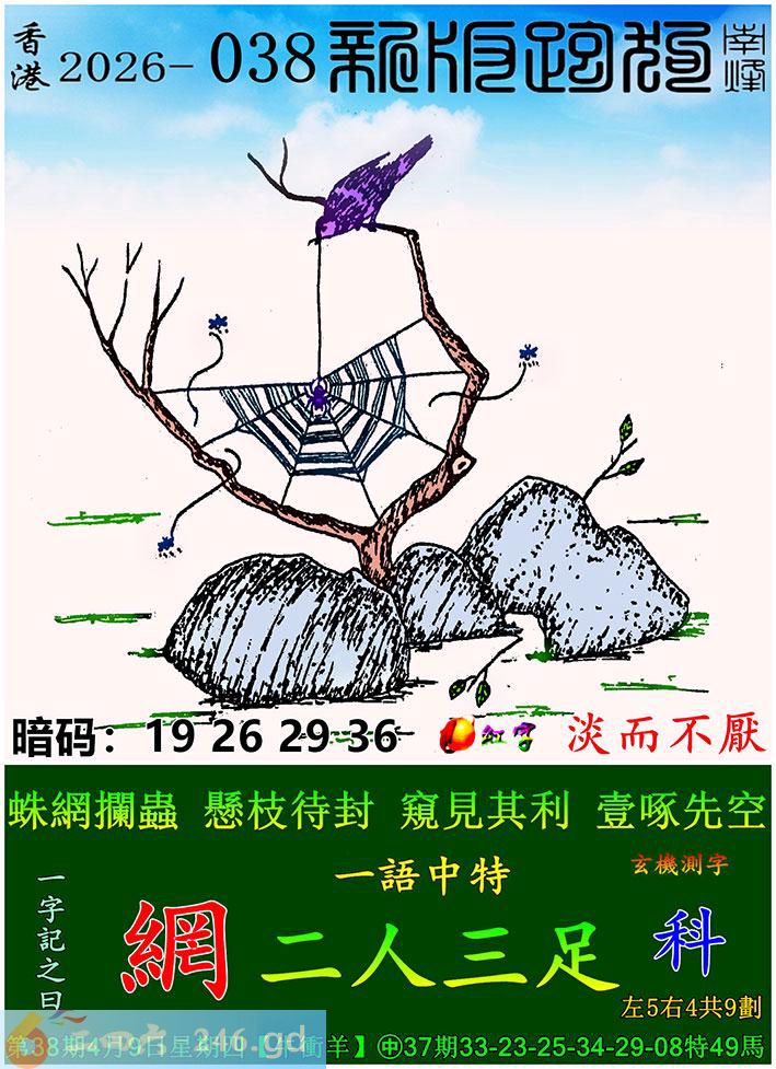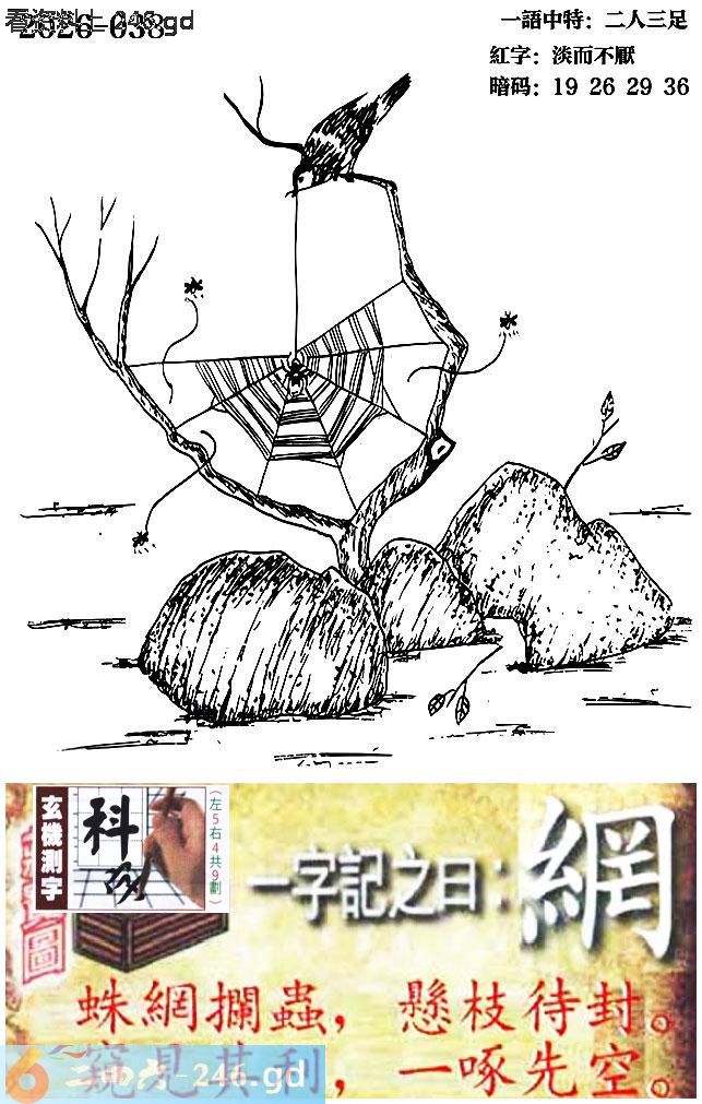 038期跑狗一字記之曰:【網】 蛛網攔蟲,懸枝待封。 窺見其利,壹啄先空。 玄機測字:《科》 一語中特:二人三足