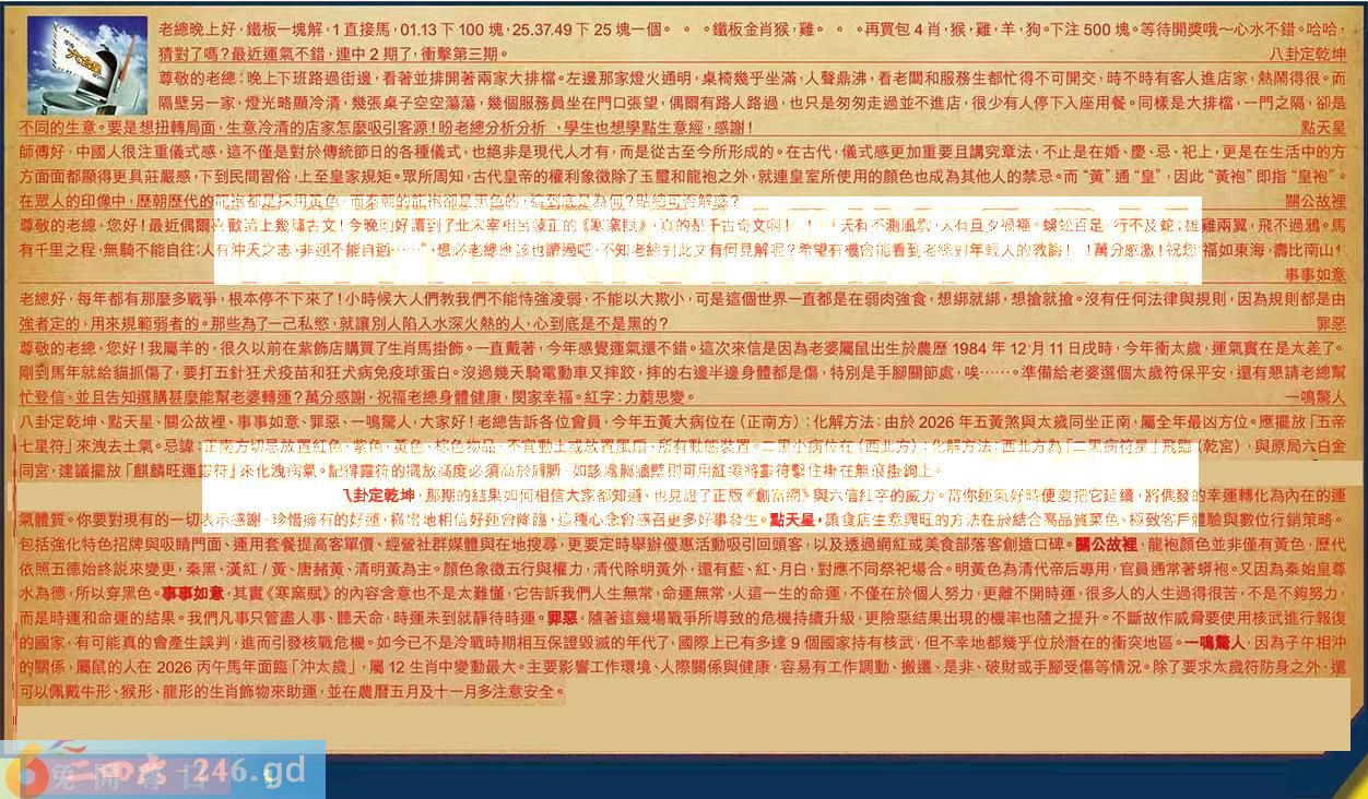 第039期《六合皇信箱文字版》10000%正確!!! 八卦定乾坤、點天星、關公故裡、事事如意、罪惡、一鳴驚人,大家好!老總告訴各位會員,今年五黃大病位在(正南方)化解方法:由於2026年五黄煞與太歲同坐正南,屬全年最凶方位。應擺放「五帝七星符」來洩去土氣。忌諱:正南方切忌放置紅色、紫色、黄色、棕色物品,不宜動土或放置風扇、所有動態装置。二黑小病位在(西北方):化解方法:西北方為「三黑病符星」飛臨(乾宮),與原局六白金同宮,建議擺放「麒麟旺運靈符」來化洩病氣。記得靈符的擺放高度必須高於后膊,如該處屬牆壁則可用紅繩將靈符繫住掛在無痕掛鉤上。 【1】.老總晚上好,鐵板一塊解,1直接馬,01.13下100塊,25.37.49下25塊一個。。。鐵板金肖猴,難。。。再買包4肖,猴,難,羊,狗。下注500塊。等待開獎哦一心水不錯。哈哈猜對了嗎?最近運氣不錯,連中2期了,衝擊第三期。八卦定乾坤 〖八卦定乾坤〗:那期的結果如何相信大家都知道,也見證了正版《創富網》與六信紅字的威力。當你運氣好時便要把它延續、將偶發的幸運轉化為內在的運氣體質。你要對現有的一切表示感謝,珍惜擁有的好運,橫蠻地相信好運會降臨,這裡心念會感召更多好事發生。 【2】.尊敬的老總:晚上下班路過街邊,看著並排開著兩家大排檔。左邊那家燈火通明,桌椅幾乎坐滿,人聲鼎沸,看老闆和服務生都忙得不可開交,時不時有客人進店家,熱鬧得很。而隔壁另一家,燈光略顯冷清,幾張桌子空空蕩蕩,幾個服務員坐在門口張望,偶爾有路人路過,也只是匆匆走過並不進店,很少有人停下入座用餐。同様是大排檔,一門之隔,卻是不同的生意。要是想扭轉局面,生意冷清的店家怎麼吸引客源!盼老總分析分析,學生也想學點生意經,感謝!點天星 〖點天星〗:讓食店生意興旺的方法在於結合高品質菜色、極致客戶體驗與數位行銷策略。包括強化特色招牌與吸睛門面、運用套餐提高客單價、經營社群媒體與在地搜尋,更要定時舉辦優惠活動吸引回頭客,以及透過網紅或美食部落客創造口碑。 【3】.師傅好,中國人很注重儀式感,這不僅是對於傅統節日的各種儀式,也絕非是現代人才有,而是從古至今所形成的。在古代,儀式感更加重要且講究章法,不止是在婚、慶、忌、祀上,更是在生活中的方方面面都顯得更具莊嚴感,下到民間習俗止上至皇家規矩。眾所周知,古代皇帝的權利象徵除了玉蝥和龍袍之外,就皇室所使用的顔色也成為其他人的禁忌。而“黄”通“皇”,因此“黄袍”即指“皇袍”。在眾人的印像中,歷朝歴代的龍袍都是採用黄色,而秦朝的龍袍卻是黑色的,這到底是為何?貼總可否解惑?關公故裡 〖關公故裡〗:龍袍顏色並非僅有黃色,歴代依照五德始終説來變更,秦黑、漢紅/黃、唐赭黃、清明黃為主。顏色象徽五行與權力,清代除明黃外,還有藍、紅、月白,對應不同祭祀場合。明黃色為清代帝后專用,官員通常著蟒袍,又因為秦始皇尊水為德,所以穿黑色。 【4】.尊敬的老總,您好!最近偶爾喜歡讀上幾篇古文!今晚剛好讓到了北宋宰相呂陵正的《寒黑賦》,真的是千古奇文啊!「天有不測風雲,人有且夕禍福。螺蚣百足,行不及蛇;雄雞兩翼,飛不過鴉。馬有千里之程,無騎不能自往;人有沖天之志非運不能自通......”想必老總應該也讀過吧,不知老總對此文有何見解呢?希望有機會能看到老總對年輕人的教誨!!萬分感激!祝您:福如東海,膏比南山!事事如意 〖事事如意〗:其實《寒窯賦》的內容含意也不是太難懂,它告訴我們人生無常,命運無常人這一生的命運,不僅在於個人努力,更離不開時運,很多人的人生過得很苦,不是不夠努力,而是時運和命運的結果。我們凡事只管盡人事、聽天命,時運未到就靜待時運。 【5】.老總好,每年都有那麼多戰爭,根本停不下來了!小時候大人們教我們不能恃強凌弱,不能以大欺小,可是這個世界一直都是在弱肉強食,想绑就绑,想搶就搶。沒有任何法律與規則,因為規則都是由強者定的,用來規範弱者的。那些為了一己私慾,就讓別人陷入水深火熱的人,心到底是不是黑的?罪惡 〖罪惡〗:隨著這幾場戰爭所導致的危機持續升級,更險惡結果出現的機率也隨之提升。不斷故作威脅要使用核武進行報復的國家,有可能真的會產生誤判,進而引發核戰危機。如今已不是冷戰時期相互保證毀滅的年代了、國際上已有多達9個國家持有核武,但不幸地都幾乎位於潛在的衝突地區。 【6】.尊敬的老總,您好!我屬羊的,很久以前在紫飾店購買了生肖馬掛飾。一直戴著,今年感覺運氣遷不錯。這次來信是因為老婆屬鼠出生於農歷1984年12月11日戌時,今年衝太歲,運氣實在是太差了。剛到馬年就給猫抓傷了,要打五針狂犬疫苗和狂犬病免疫球蛋白。沒過幾天騎電動車又摔跤,摔的右邊半邊身體都是傷,特別是手腳關節處,唉.......。準備給老婆選個太歲符保平安,邏有懇請老總幚忙登信。並且告知選購甚麼能幫老婆轉運?萬分感謝,祝福老總身體健康,閔家幸福。紅字:力薛思變。一鳴警人 〖一鳴驚人〗:因為子午相沖的關係,屬鼠的人在2026丙午馬年面臨「沖太歳」,屬12生肖中變動最大。主要影響工作環境、人際關係與健康,容易有工作調動、搬邏、是非、破財或手腳受傷等情況。除了要求太歲符防身之外,還可以佩戴牛形、猴形、龍形的生肖飾物來助運,並在農暦五月及十一月多注意安全。 紅字:免開尊