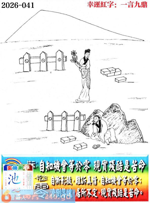 041期老版跑狗一字記之曰:【零】 詩雲:自知機會等於零,現實殘酷是苦命。 自慚形穢,難訴真情,自知機會等於零; 潦倒落魄,居所不定,現實殘酷是苦命。 玄機測字:《池》
