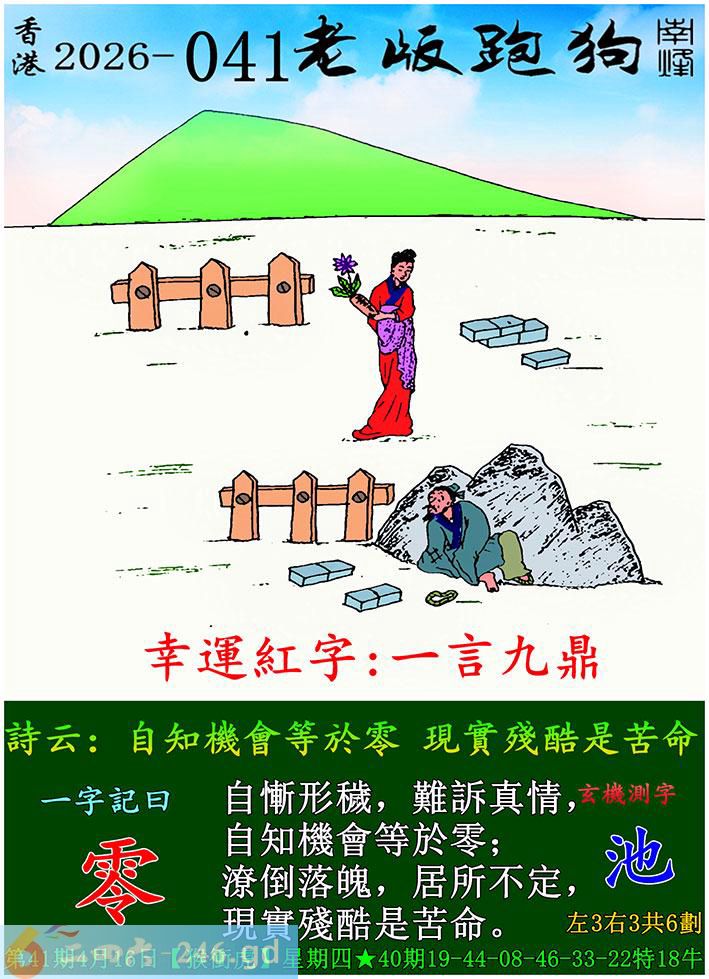 041期老版跑狗一字記之曰:【零】 詩雲:自知機會等於零,現實殘酷是苦命。