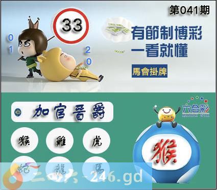 041期正版彩图挂:33爆:猴挂牌成语:加官晋爵挂牌出肖:猴鸡虎蛇龙马
